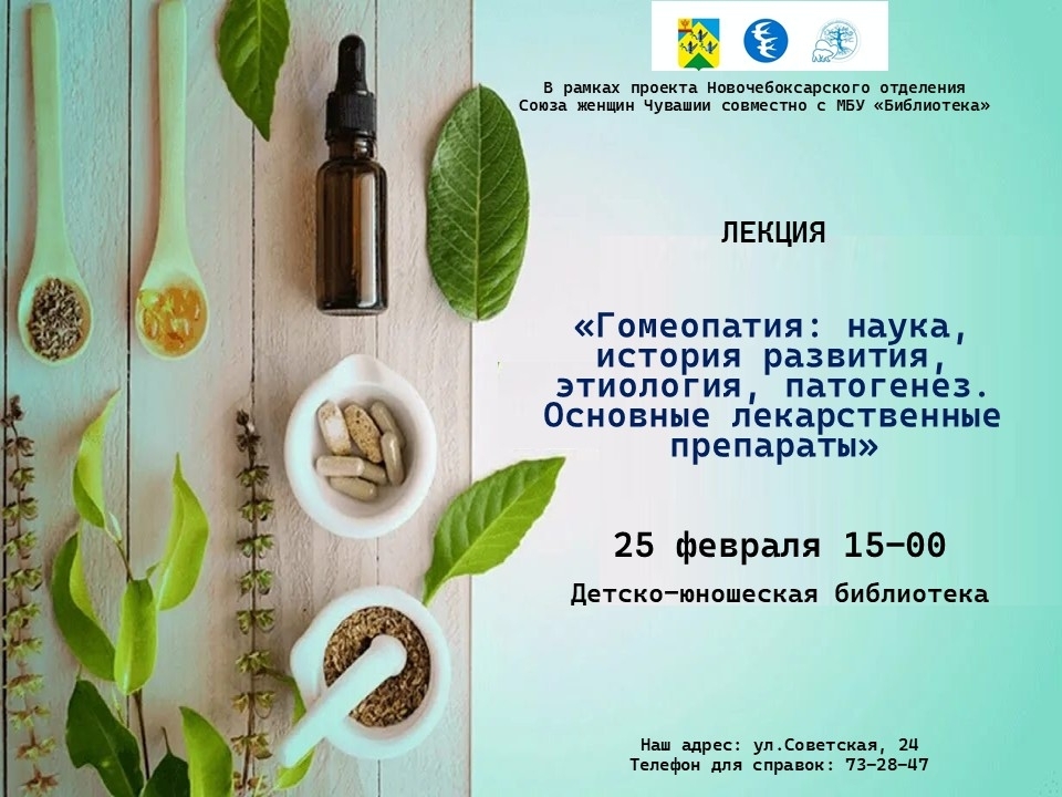 Сегодня, 25 февраля в 15:00 в детско-юношеской библиотеке города Новочебоксарск состоится лекция на тему «Гомеопатия: наука, история развития, этиология, патогенез. Основные лекарственные препараты».
